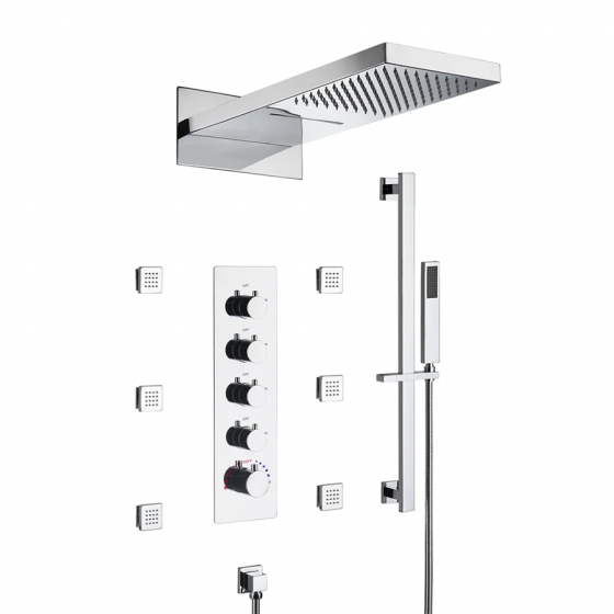 Aperçu rapide WishList Compare Ajouter au panier Composition thermostatique de douche led... "Rome" élève l'art de la douche avec sa composition thermostatique LED murale à encastrer chrome. Ce système avant-gardiste qui change de couleur selon la température assure une expérience visuelle sans pareil, le tout fonctionnant écologiquement sans pile ni électricité. Doté d'une robinetterie offrant trois fonctions indépendantes, "Rome" permet un contrôle précis et personnalisé de votre expérience de douche, combinant pluie, cascade et douchette à main. Son design élégant s'harmonise avec toute salle de bain contemporaine, apportant une touche de sophistication et de technologie. La composition de douche led thermostatique "Rome" offre sécurité, économie d'énergie et une expérience de douche inégalée. Transformez votre salle de bain avec "Rome" où fonctionnalité rencontre luxe durable. 990,90 € Prix