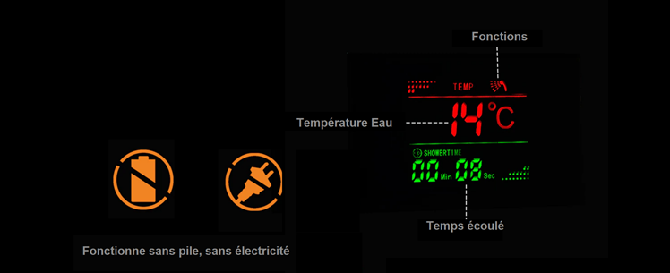 • Affichage intelligent: Température et temps visualisés pour une expérience de douche sécurisée et parfaitement maîtrisée.
